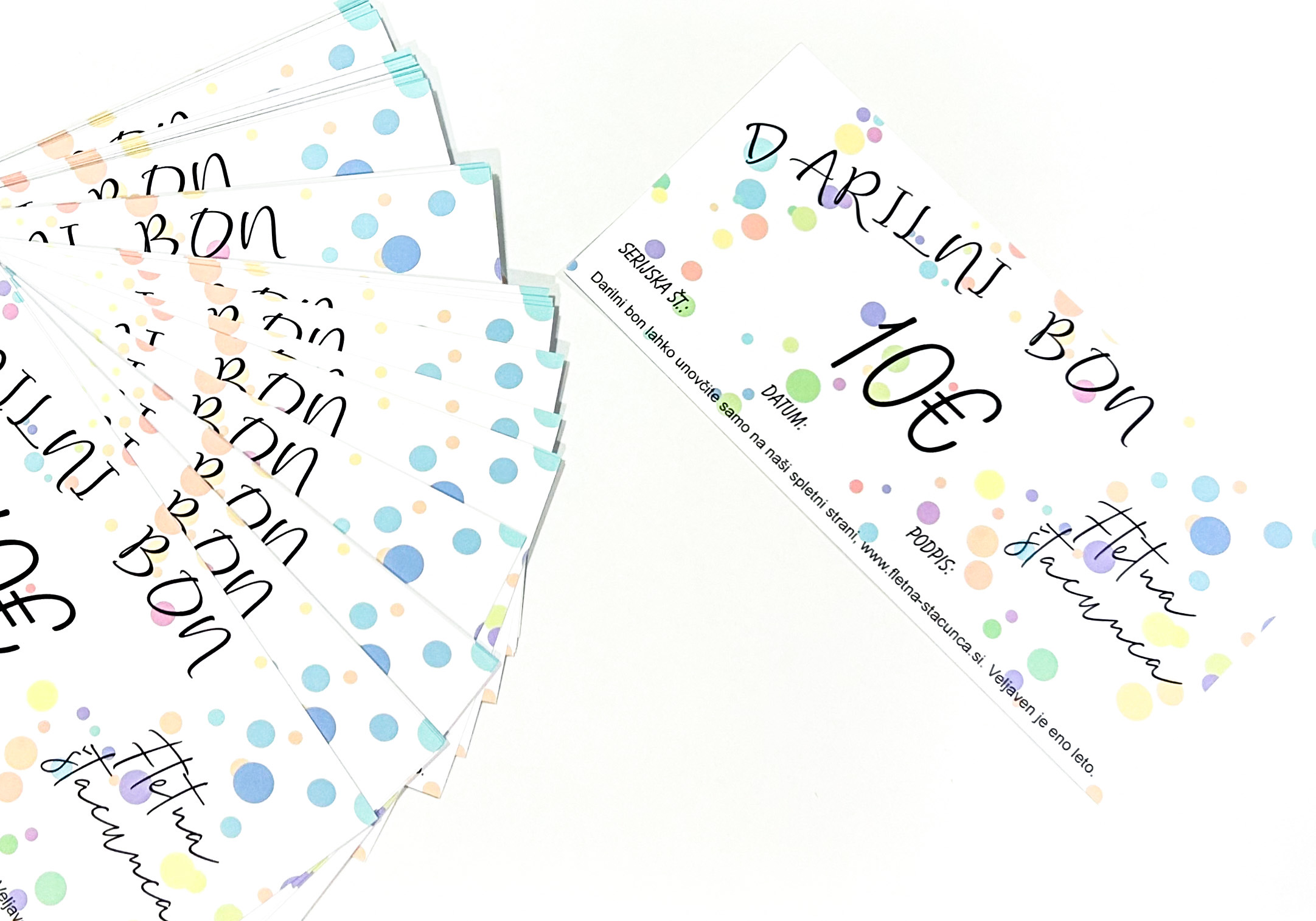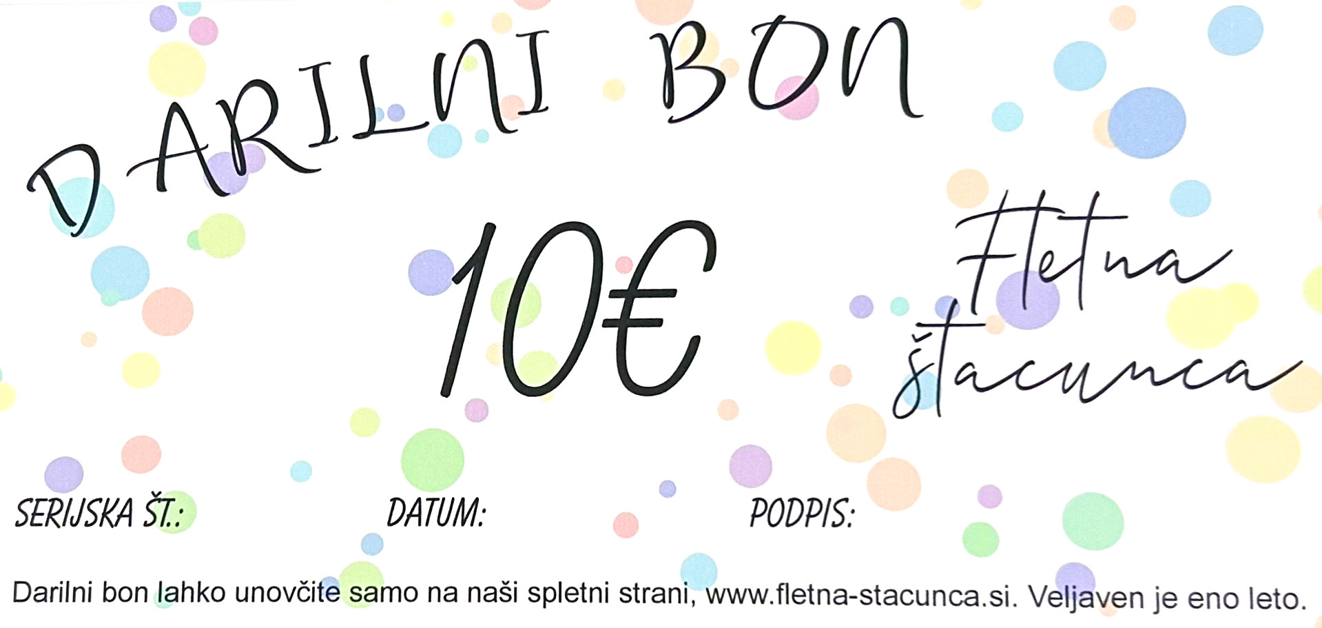 Darilne bone pošljemo po pošti ali po mailu. V kolikor želite po mailu, ob naročilu pošljite mail na info@fletna-stacunca.si, saj v tem primeru ne zaračunamo dostave.